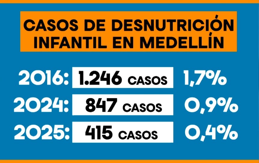 Pasaron 10 años antes de que en la capital antioqueña se lograra alcanzar una cifra histórica en materia de desnutrición infantil. Entre 2016 y 2024, las cifras se ubicaron entre 1.246 casos y 847 casos respectivamente. Este año, la reducción es histórica: 415 casos de desnutrición infantil se han registrado con corte al 15 de noviembre.