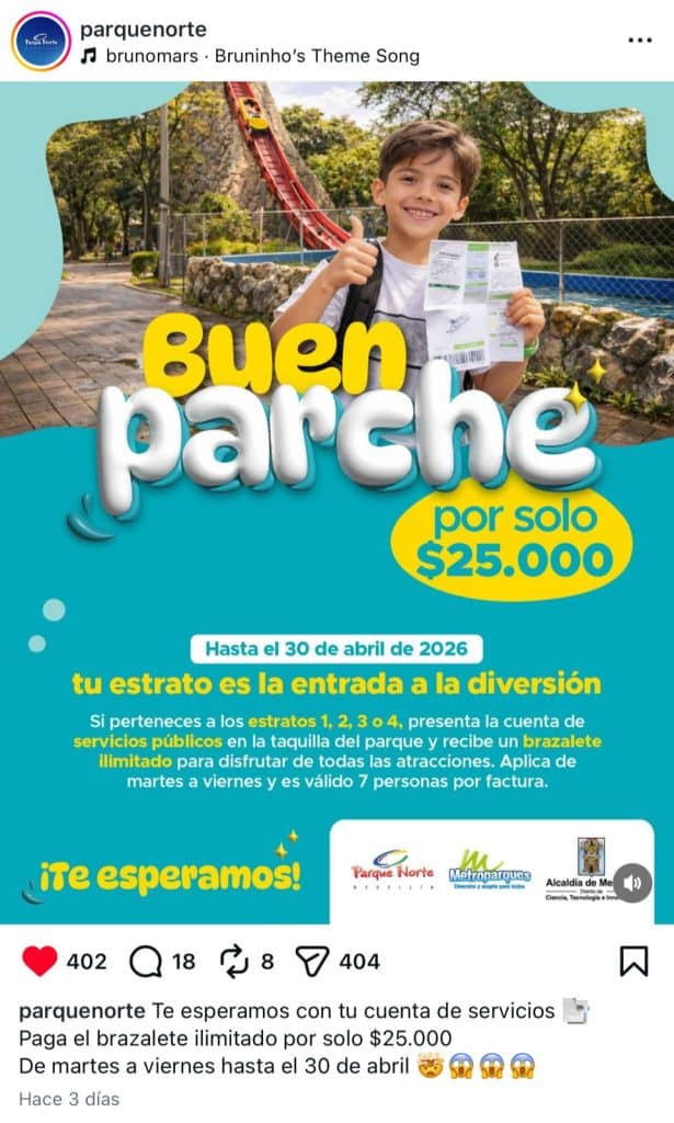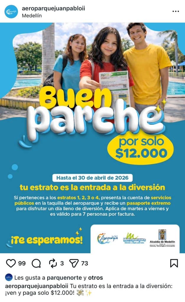 La iniciativa está dirigida a personas que pertenezcan a los estratos 1, 2, 3 y 4, quienes podrán acceder a un brazalete ilimitado del Parque Norte por solo $25.000 por persona y en el Aeroparque Juan Pablo II brazalete por $12.000.