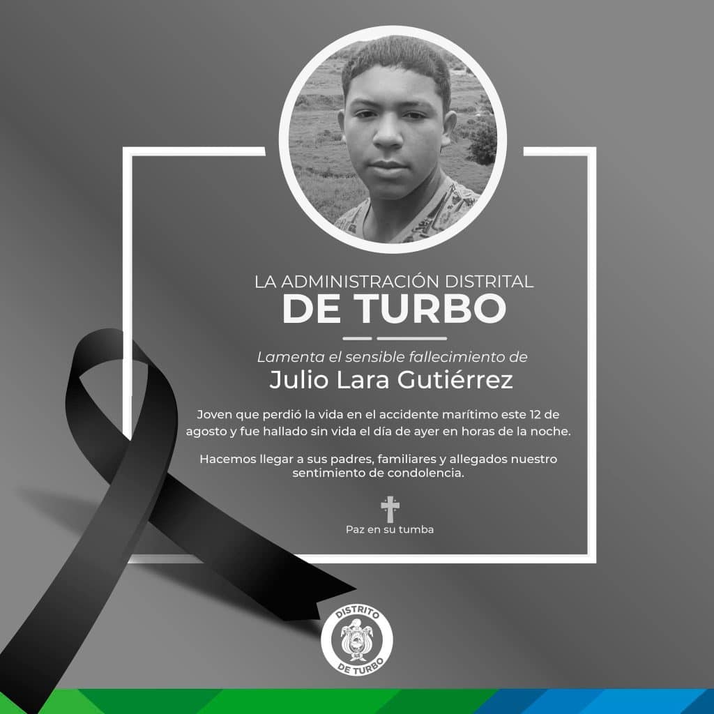 Hay luto en Urabá por la muerte de Julio Lara Gutiérrez, un joven de 17 años que había sido reportado como desaparecido desde el 12 de agosto tras un choque de embarcaciones en Urabá.