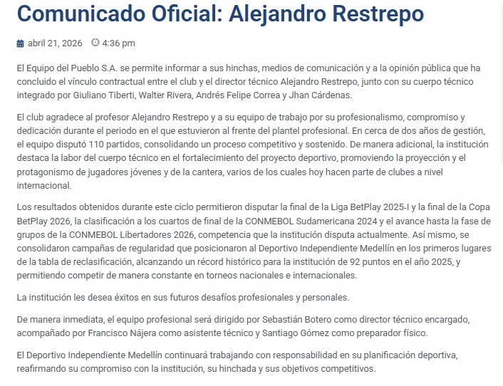 Por medio de un comunicado, el equipo poderoso informó que Alejandro Restrepo ya no es más el entrenador del plantel profesional.
