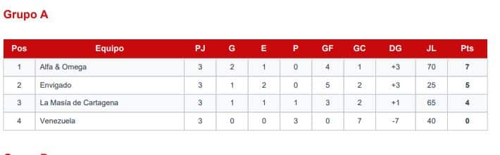 De esta manera, se resolvió "oficiar como resultado final de los encuentros Venezuela vs. La Masía de Cartagena y Venezuela vs. Alfa & Omega dos (2) dos por cero a favor de La Masía de Cartagena y Alfa & Omega".