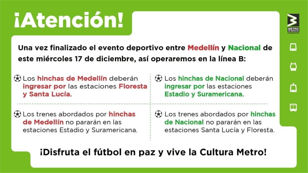Para esta final por Copa Colombia que reúne a miles de aficionados de toda la ciudad, al finalizar el encuentro deportivo los hinchas de Medellín y nacional deberán abordar en la línea B del Metro en estaciones específicas.