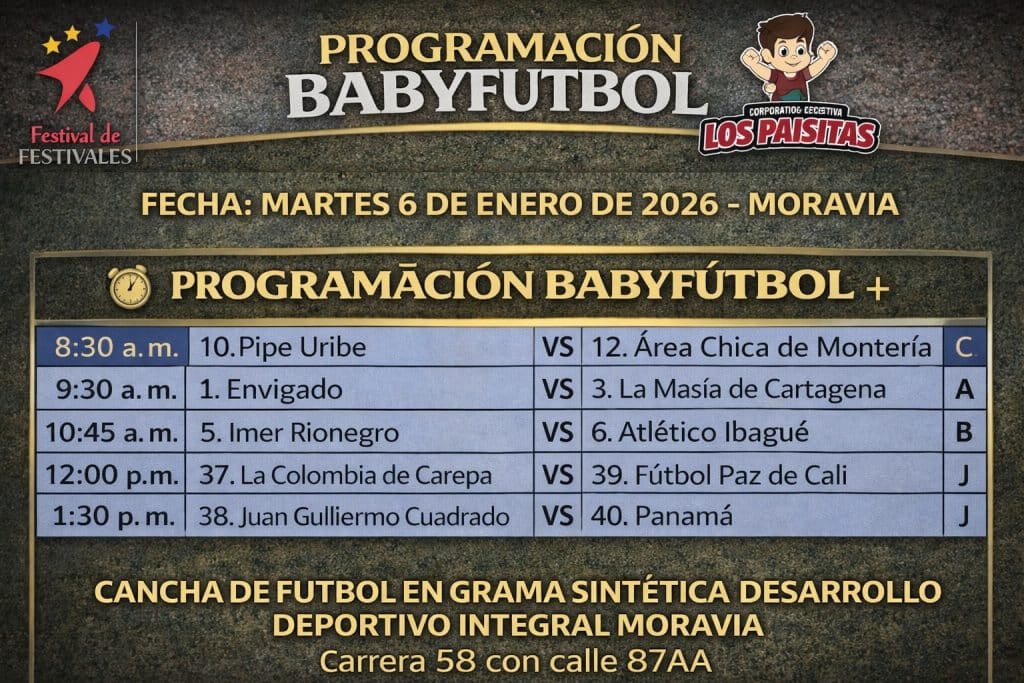 Por su parte, la jornada de encuentros que se disputan en la cancha Marte #1 se disputará con normalidad, pero el encuentro entre Envigado Vs. La Masía de Cartagena, se disputará el martes, 6 de enero, a partir de las 9:30 a. m. en la cancha de Moravia.