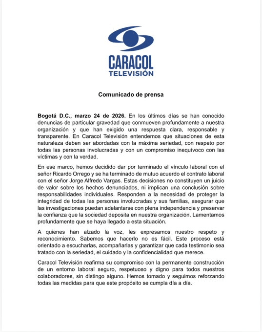Por medio de un comunicado, Caracol Televisión anunció la terminación del contrato de los periodistas y presentadores Ricardo Orrego y Jorge Alfredo Vargas, luego de las denuncias por presunto acoso sexual al interior de la entidad.