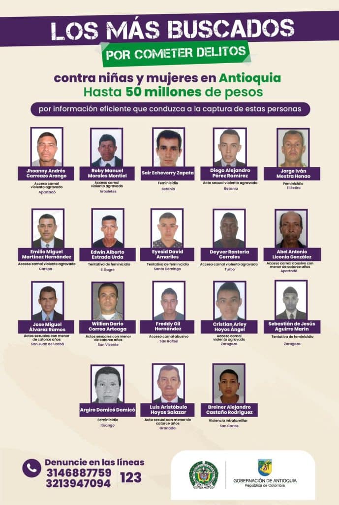 Las autoridades han habilitado la línea 123 para que los ciudadanos brindan información que permita ubicar a estos agresores de menores y mujeres en Antioquia.