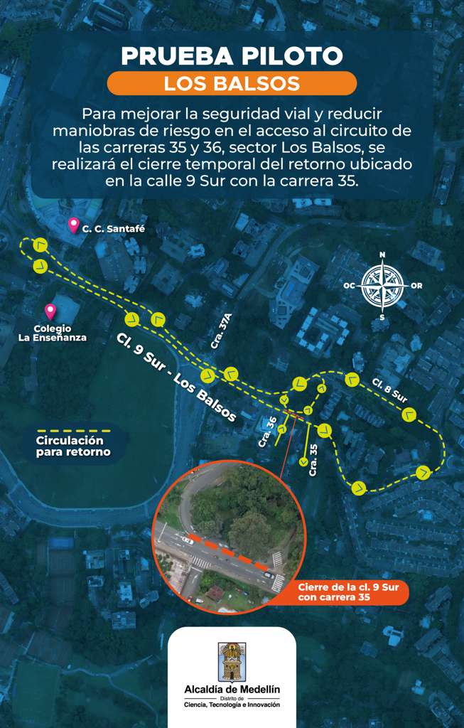 Como parte de una prueba piloto en Los Balsos, a partir de este martes se realizará el cierre temporal del retorno ubicado en la calle 9 Sur con carrera 35, suroriente de la ciudad, informó la Secretaría de Movilidad.
