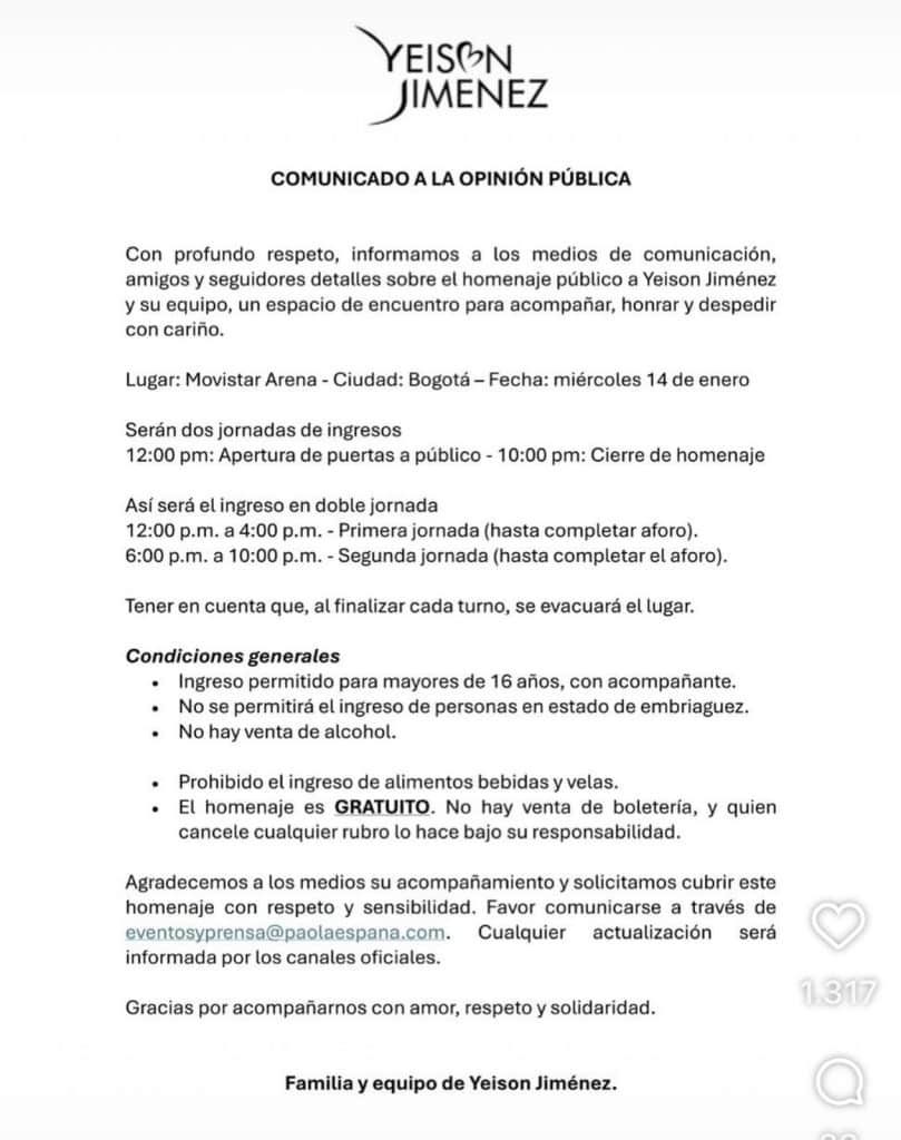 La organización Yeison Jiménez dio detalles de cómo será el homenaje al artista este miércoles, 14 de enero, en el Movistar Arena de Bogotá.