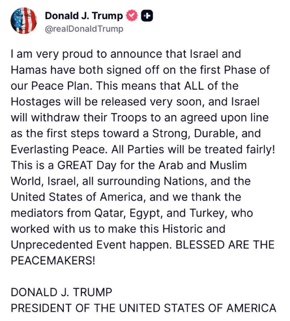 "Me enorgullece anunciar que Israel y Hamás han firmado la primera fase de nuestro Plan de Paz. Esto significa que todos los rehenes serán liberados muy pronto e Israel retirará sus tropas a una línea acordada como primer paso hacia una paz sólida y duradera. Todas las partes recibirán un trato justo".
