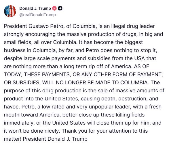 A través de su red social Truth, Trump calificó como líder narcotraficante al presidente de Colombia, Gustavo Petro, y amenazó con retirar los pagos y subsidios al país, en la lucha contra las drogas.