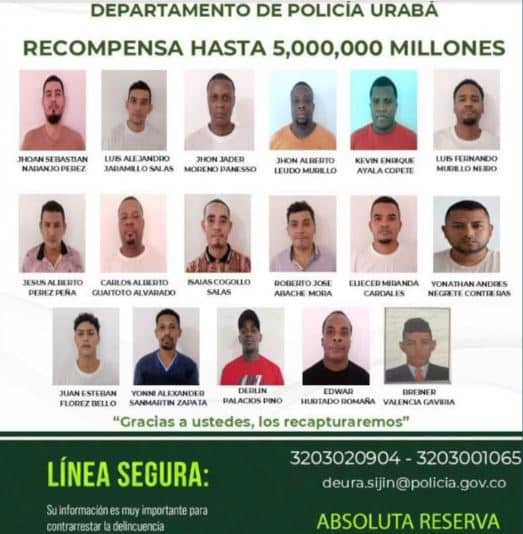 Las autoridades desplegaron un amplio operativo de búsqueda en toda la región de Urabá antioqueño, especialmente sobre la vía que conduce a Medellín, ante la posibilidad de que los fugitivos intenten escapar por esa ruta.