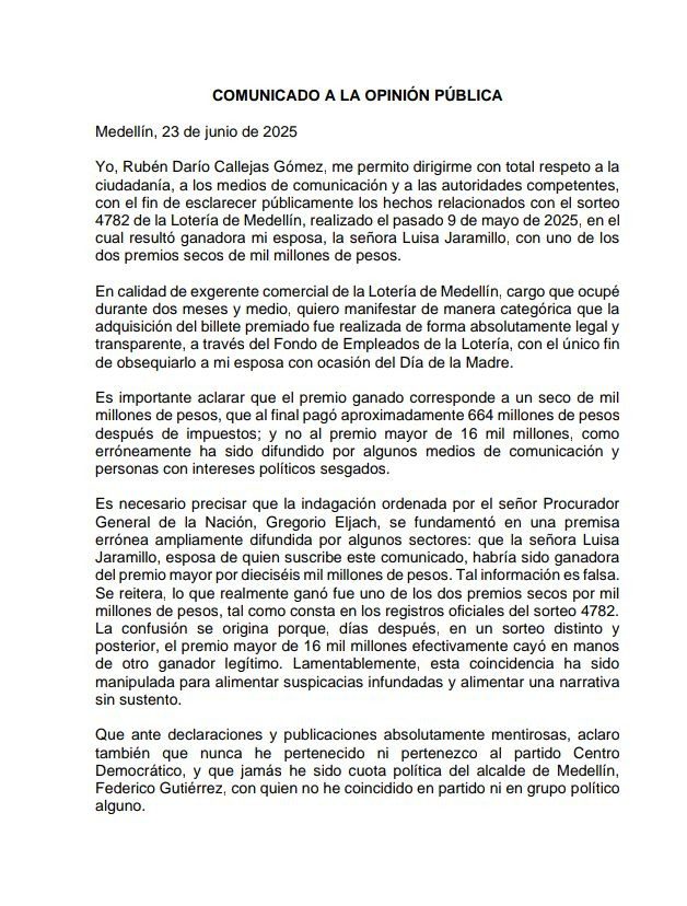 Por medio de un comunicado, el exsubegerente comercial de la Lotería de Medellín Rubén Darío Callejas, explicó que el premio ganado por su esposa, un seco de mil millones de pesos, fue adquirido de forma legal y transparente, a través del fondo de empleados de la Lotería.