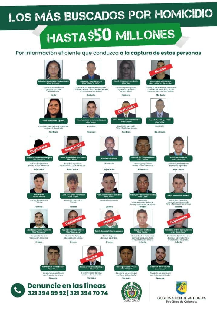 El secretario de seguridad de Antioquia, Luis Eduardo Martínez explica: “El cartel consta de 27 criminales los cuales tienen orden de captura vigente y lo que le pedimos a la comunidad es que por favor nos ayuden a sacarlos de circulación y verán que con esto podemos ralentizar el homicidio y neutralizar el accionar de estos criminales”