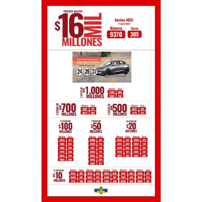 El número ganador del premio mayor fue el 9370, de la serie 305. Si no acertó, no tiene que esperar al próximo sorteo, pues puede revisar si ganó en algunos de los premios secos.