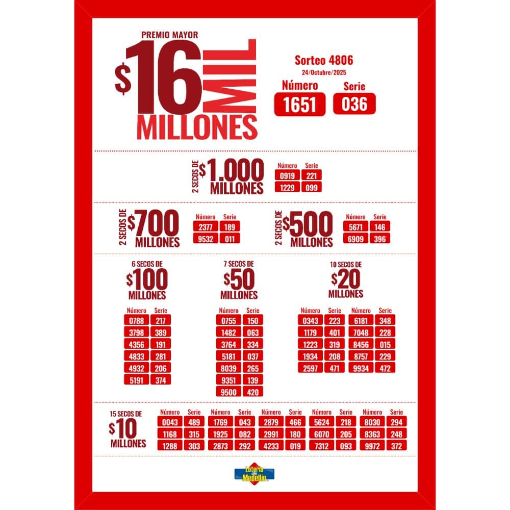 Se jugó el sorteo 4806 de la Lotería de Medellín del viernes, 24 de octubre de 2025. Si usted hizo el chance, revise sus recibos, pues puede ser uno de los ganadores.