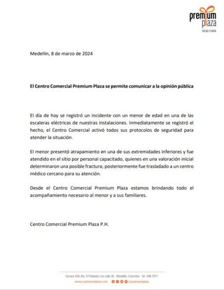 En el documento, el Centro comercial aseguró que desde el momento del incidente, han brindado acompañamiento a la familia del menor afectado.