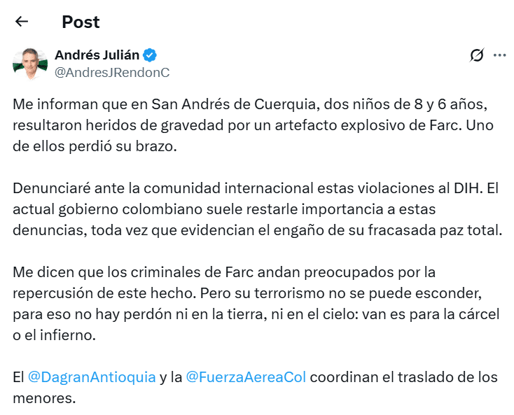 Un grave hecho se registró este viernes, 10 de octubre, en el municipio de San Andrés de Cuerquia, norte de Antioquia, donde dos niños de 8 y 6 años resultaron heridos por un artefacto explosivo, informó el gobernador Andrés Julián Rendón.