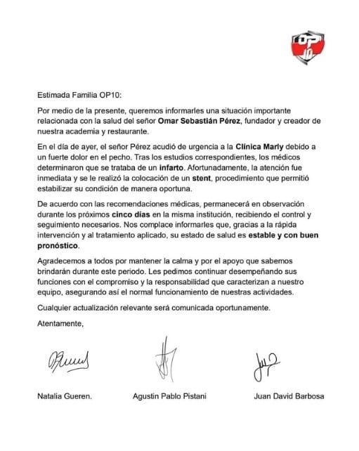 El comunicado agrega que el exjugador argentino fue atendido por la Clínica Marly en Bogotá, ciudad donde está radicado Omar Pérez hace años, quien ingresó al centro médico debido a un fuerte dolor en el pecho.