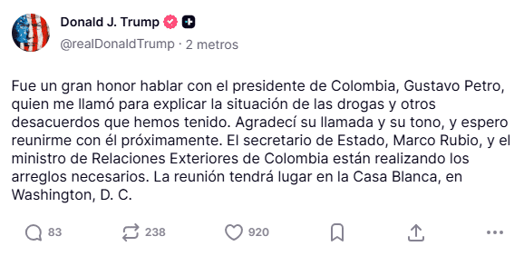 En sus redes sociales, el presidente Donald Trump aseguró que Petro fue quien lo llamó para explicar la situación de las drogas y otros desacuerdos. "Agradecí su llamada y su tono, y espero reunirme con él próximamente".