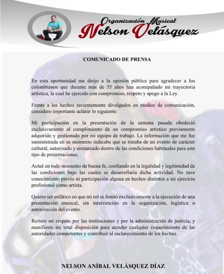 Después de seis días y la posible investigación, el artista Nelson Velásquez se pronunció en un comunicado, sostuvo que en sus 35 años de carrera ha actuado apegado a la ley y actuó de buena fe, confiando en la legalidad y la legitimidad de las condiciones de la actividad.