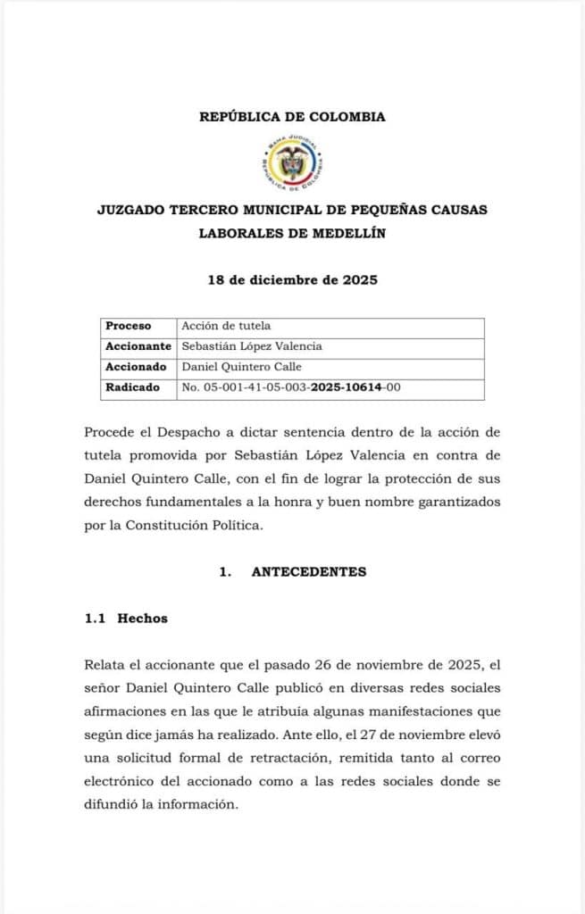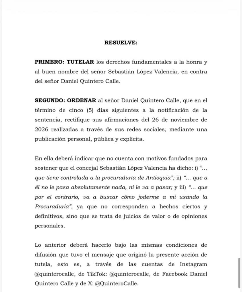 El fallo judicial, emitido el 18 de diciembre, responde a una acción de tutela interpuesta por López, luego de que el pasado 26 de noviembre Quintero lo acusara, a través de sus plataformas digitales, de supuestamente manejar la Procuraduría de Antioquia con fines de persecución política.