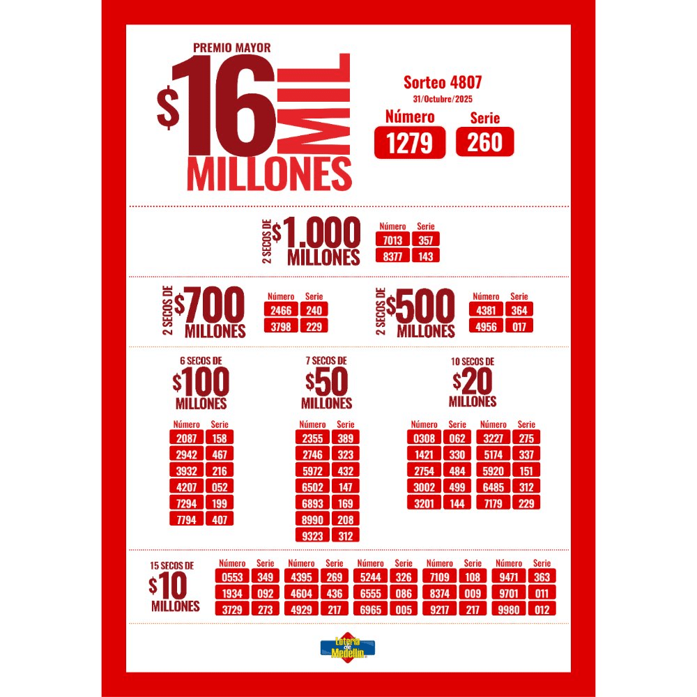 Se jugó el sorteo 4807 de la Lotería de Medellín del viernes, 24 de octubre de 2025. Si usted hizo el chance, revise sus recibos, pues puede ser uno de los ganadores.