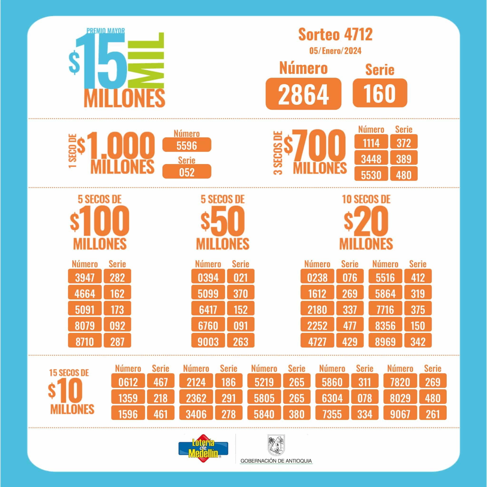 Se jugó el sorteo 4712 de la Lotería de Medellín del viernes, 5 de enero de 2024. Si usted hizo el chance revise sus recibos pues puede ser uno de los ganadores.