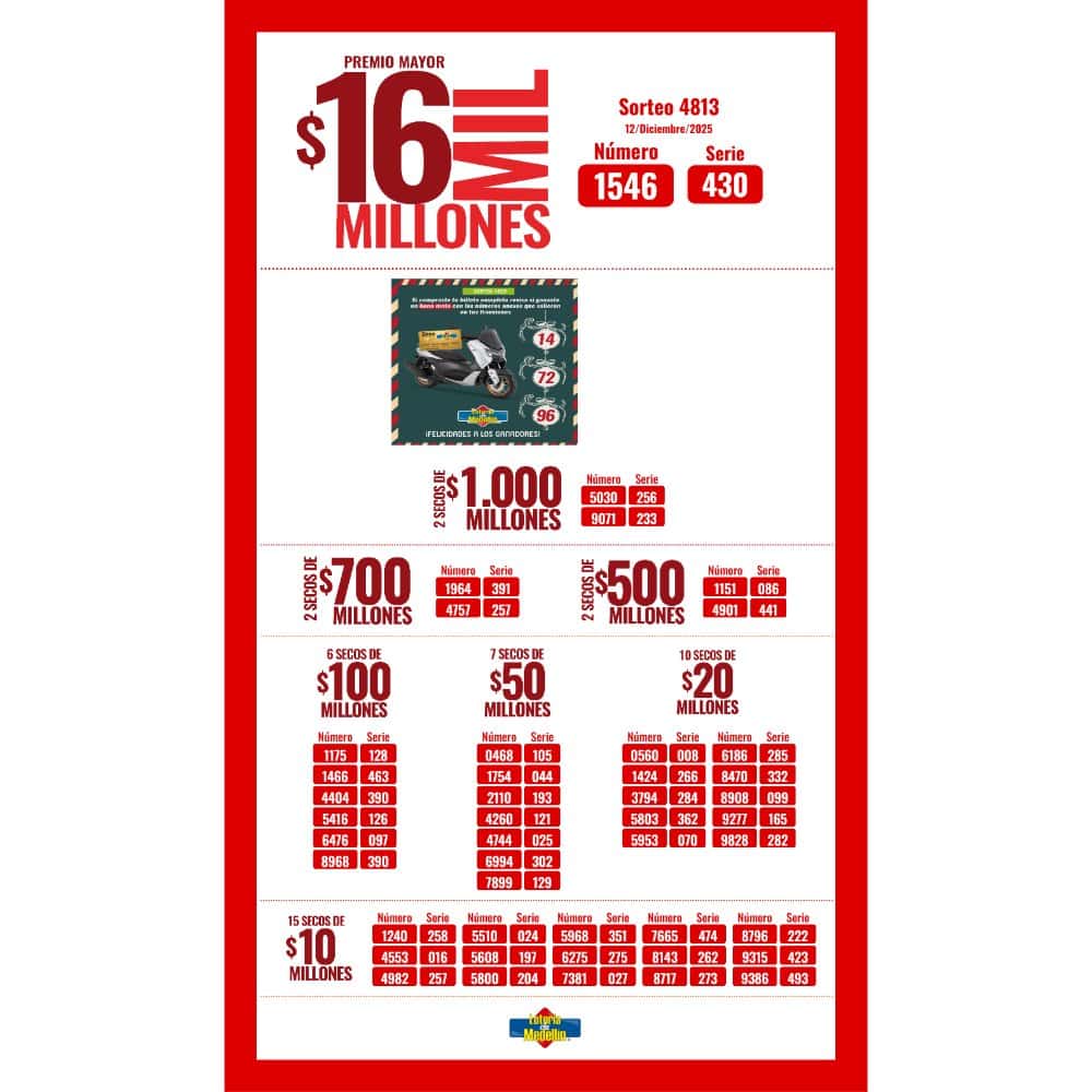Se jugó el sorteo 4813 de la Lotería de Medellín del viernes, 12 de diciembre de 2025. Si usted hizo el chance, revise sus recibos, pues puede ser uno de los ganadores.