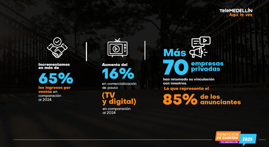 Dentro de los principales logros durante el 2025 se encuentra la obtención del primer India Catalina por el especial "Explotación Sexual Infantil, una verdad a medias", el aumento en un 28% del rating de Noticias Telemedellín, la transmisión del Desfile de Silleteros más vista de todos los tiempos, más de 5 millones de usuarios en nuestra comunidad digital, el 70% de favorabilidad en la encuesta Medellín Cómo Vamos, incremento en más del 65% de las ventas, en comparación al 2024, entre otros.
